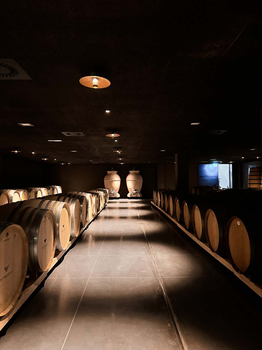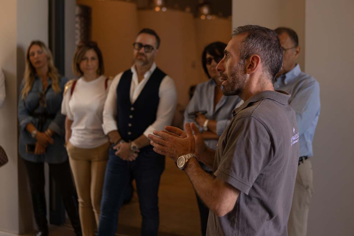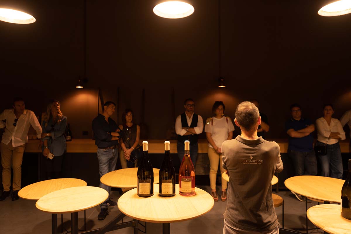 Al termine del test drive gli ospiti hanno avuto il privilegio di poter effettuare la visita guidata della cantina Pietradolce, per conoscere tutto il sito produttivo: una cantina ipogea la cui realizzazione è improntata a una filosofia ecosostenibile. Roccia vulcanica, ferro, legno e terra dei vigneti sono stati utilizzati da artisti e artigiani per realizzare importanti opere d’arte esposte tra le botti, in un connubio ideale tra il mondo del vino e quello culturale.